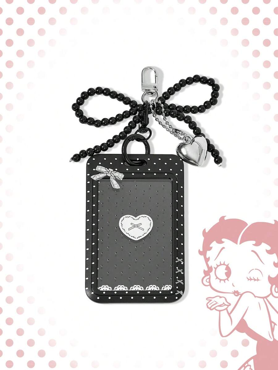 1 Portachiavi con porta carte Betty Boop a pois neri, ciondolo con fiocco di perline nere