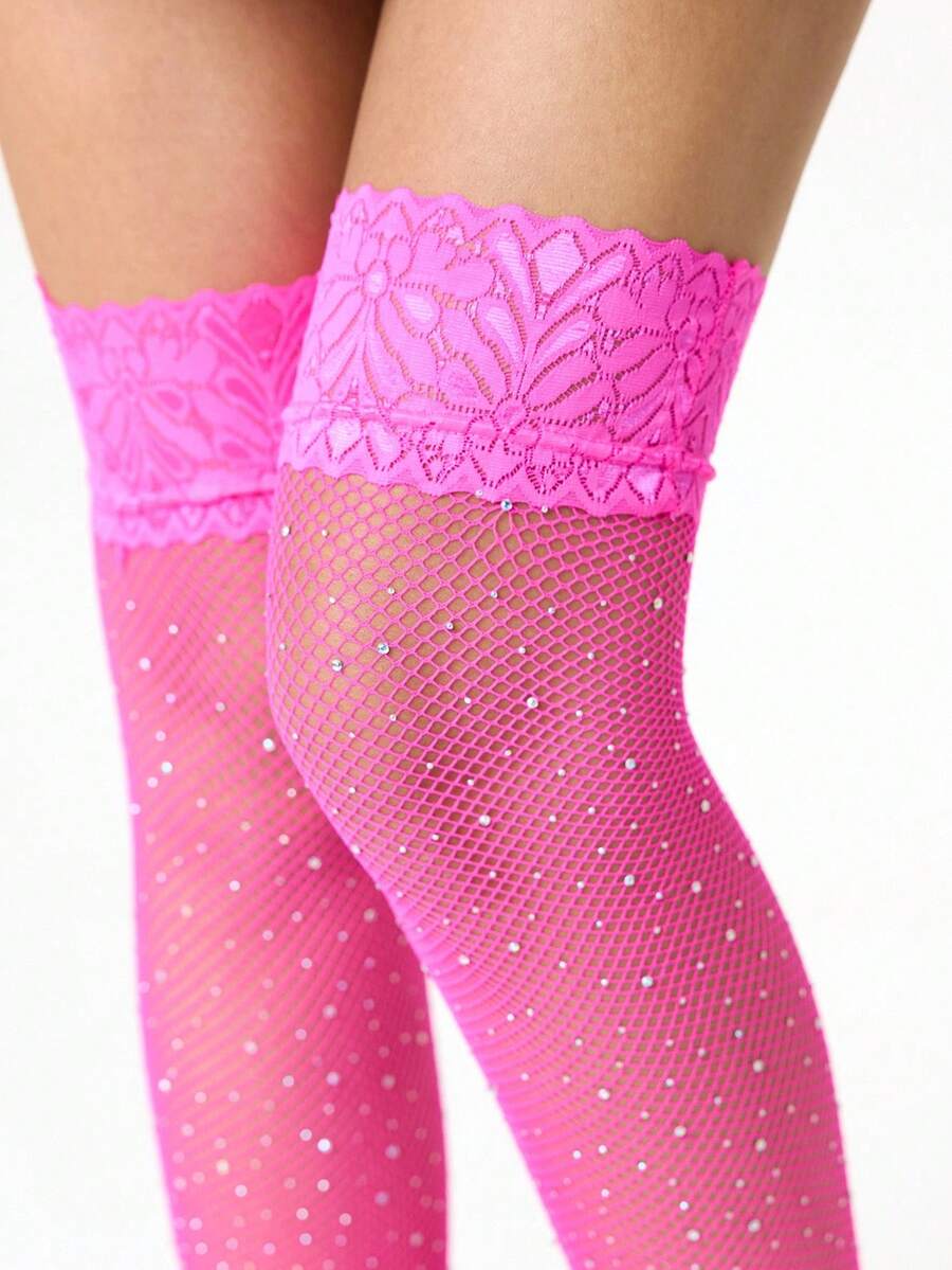 Kawaii 1 Paio Di Calze Autoreggenti Alla Coscia Alla Moda E Sexy Con Decorazioni Di Strass Fucsia, Minimaliste E Romantiche In Rete, Adatte Per Festival Musicali, Appuntamenti, Gale