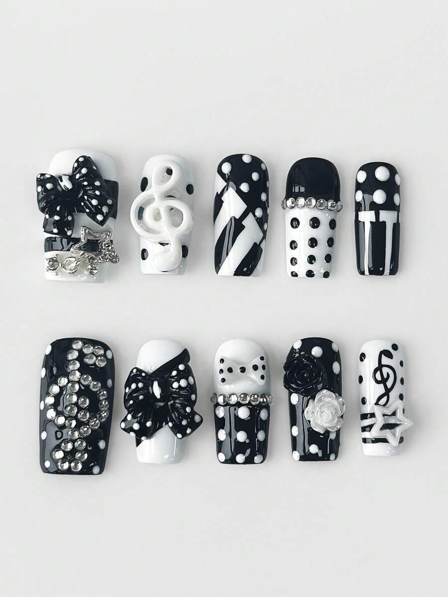 10 pezzi di unghie finte con stile carino, motivo a pois dipinto a mano + 3 pezzi di nastro biadesivo, stile retrò con elementi di chiavi in bianco e nero, stelle, fiocchi, note, manicure, unghie quadrate lunghe con diamanti rimovibili in stile Y2K, manicure riutilizzabile per tutte le stagioni, adatto per uso quotidiano e appuntamenti
