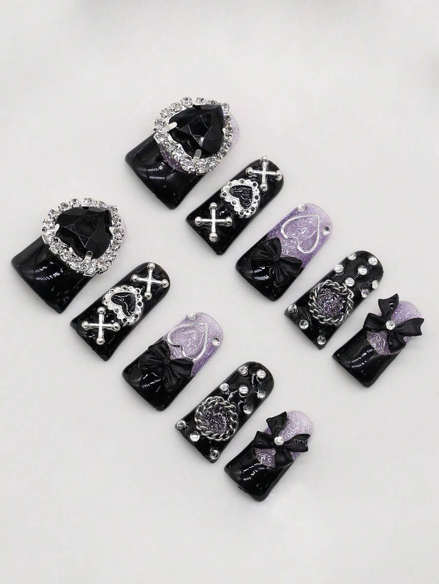 Anime 10 pezzi Unghie finte di alta qualità stile gotico con decorazioni a fiocco e cuore + 3 pezzi di adesivo biadesivo, adesivi decorativi per unghie rimovibili con glitter e strass in stile Y2K, adatti per festival, feste, balli e uso quotidiano, Ognissanti