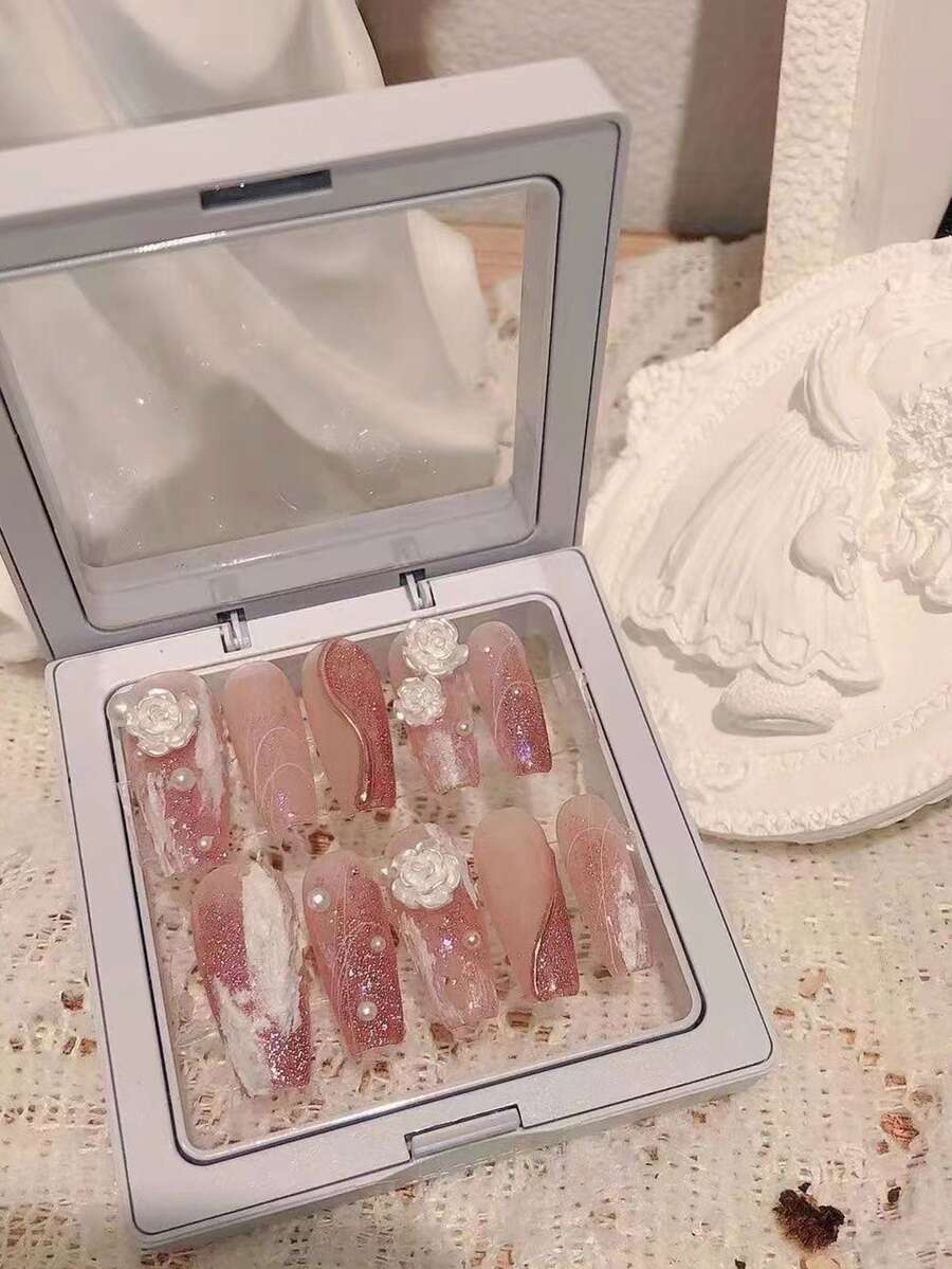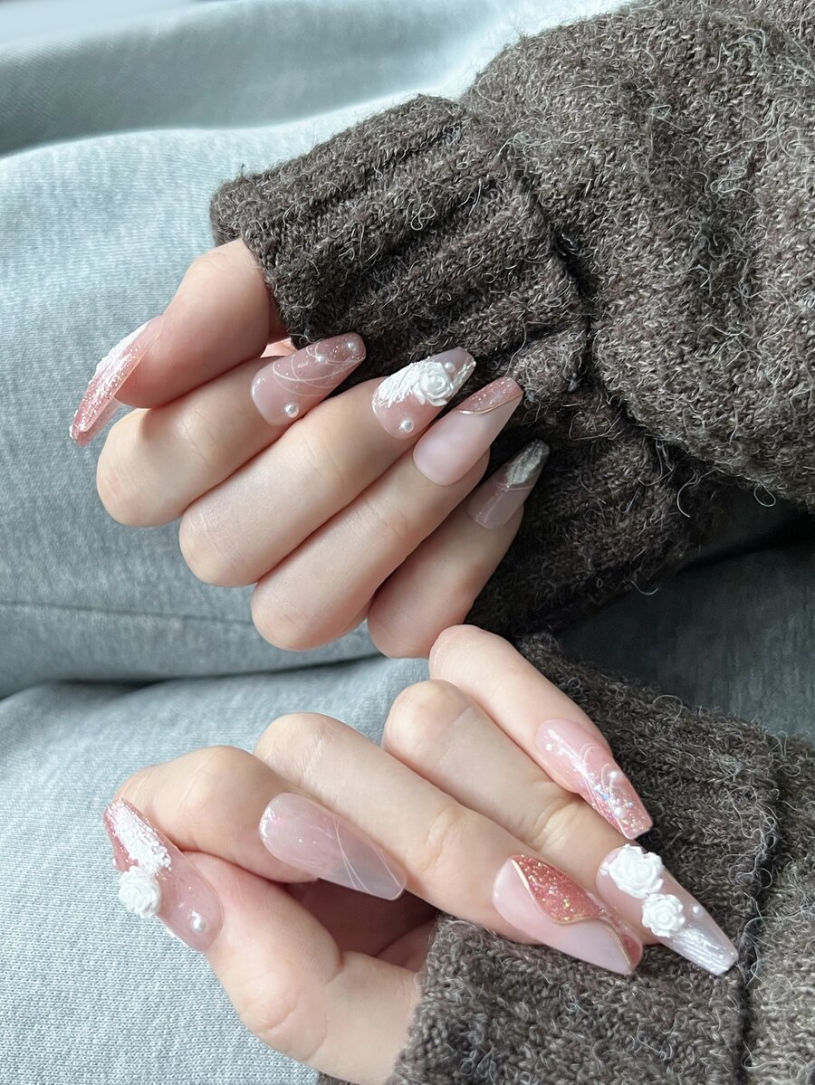 10 pezzi lungo bara 3D con decorazione floreale Unghie finte & 1 foglio nastro