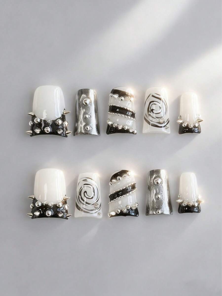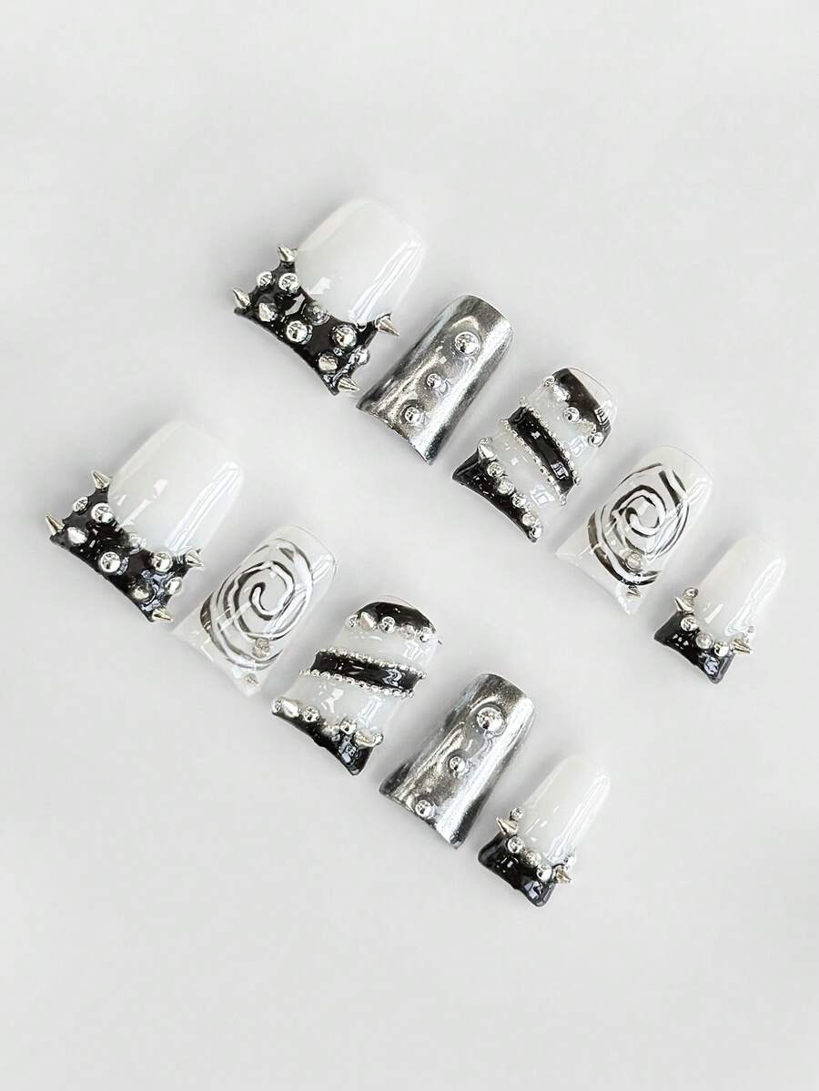 Anime 10 pezzi di unghie finte di alta qualità in stile Y2K con decorazioni a fiocco, teschio, croce e stella + 3 pezzi di adesivi per unghie rimovibili con strass a contrasto di colore, adatti per vacanze, feste, balli e uso quotidiano