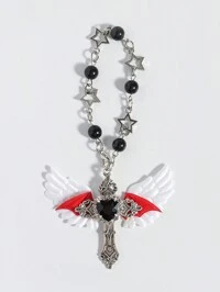 Kawaii 1 pezzo Ciondolo portachiavi/charm per borsa/decorazione telefono in stile gotico vintage Y2K, con fiore d'argento in resina, perline, cristallo nero 3D a forma di cuore con ali e croce, adatto come regalo quotidiano/festivo per le donne, Ognissanti