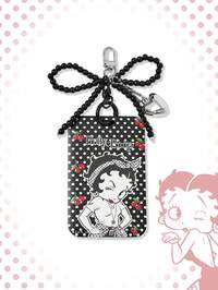 1 Portachiavi con porta carte Betty Boop a pois neri, ciondolo con fiocco di perline nere