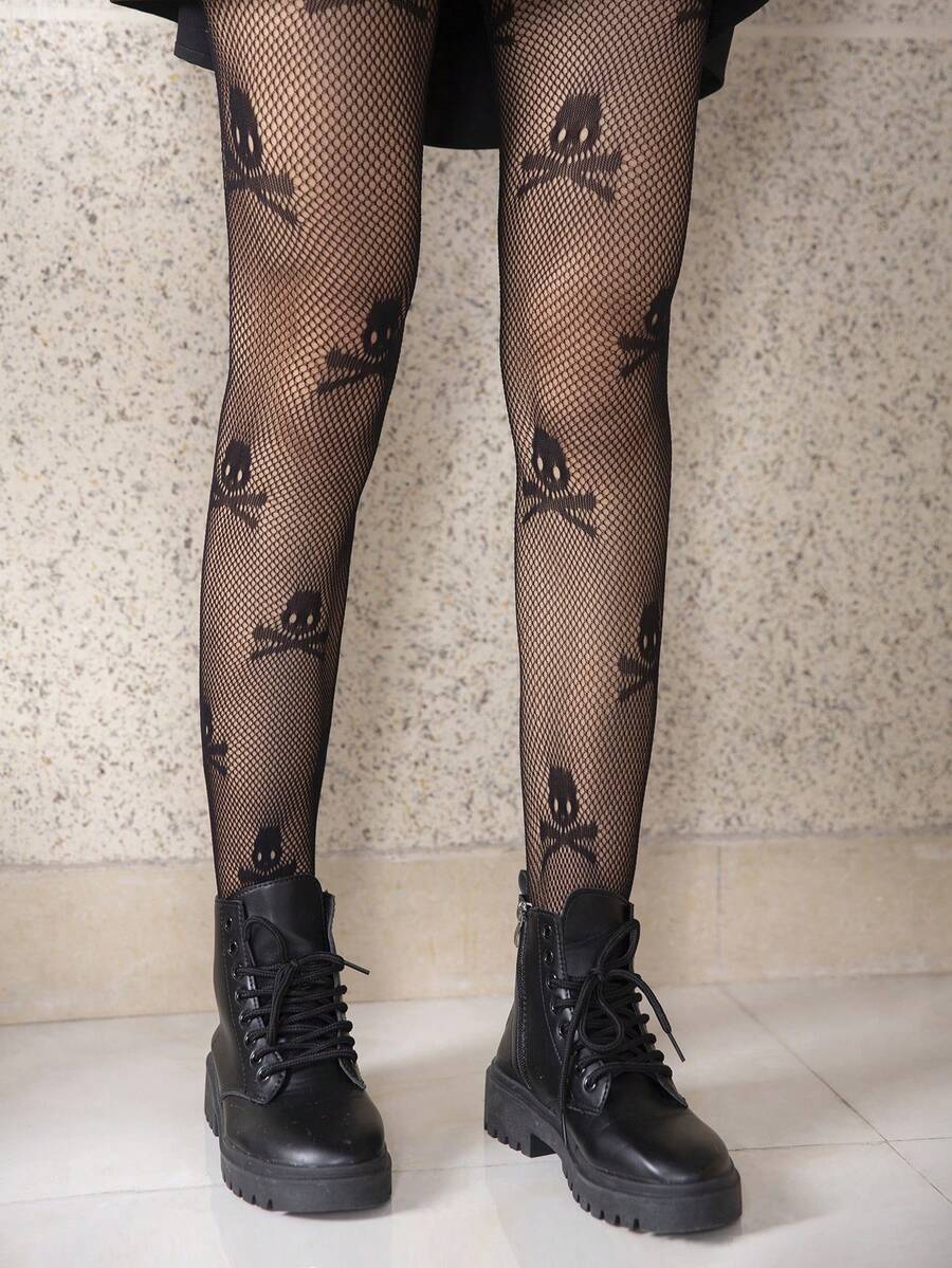 1 pezzo Leggings neri con motivo teschio sexy da donna, calze a rete vuote punk per abbigliamento streetwear