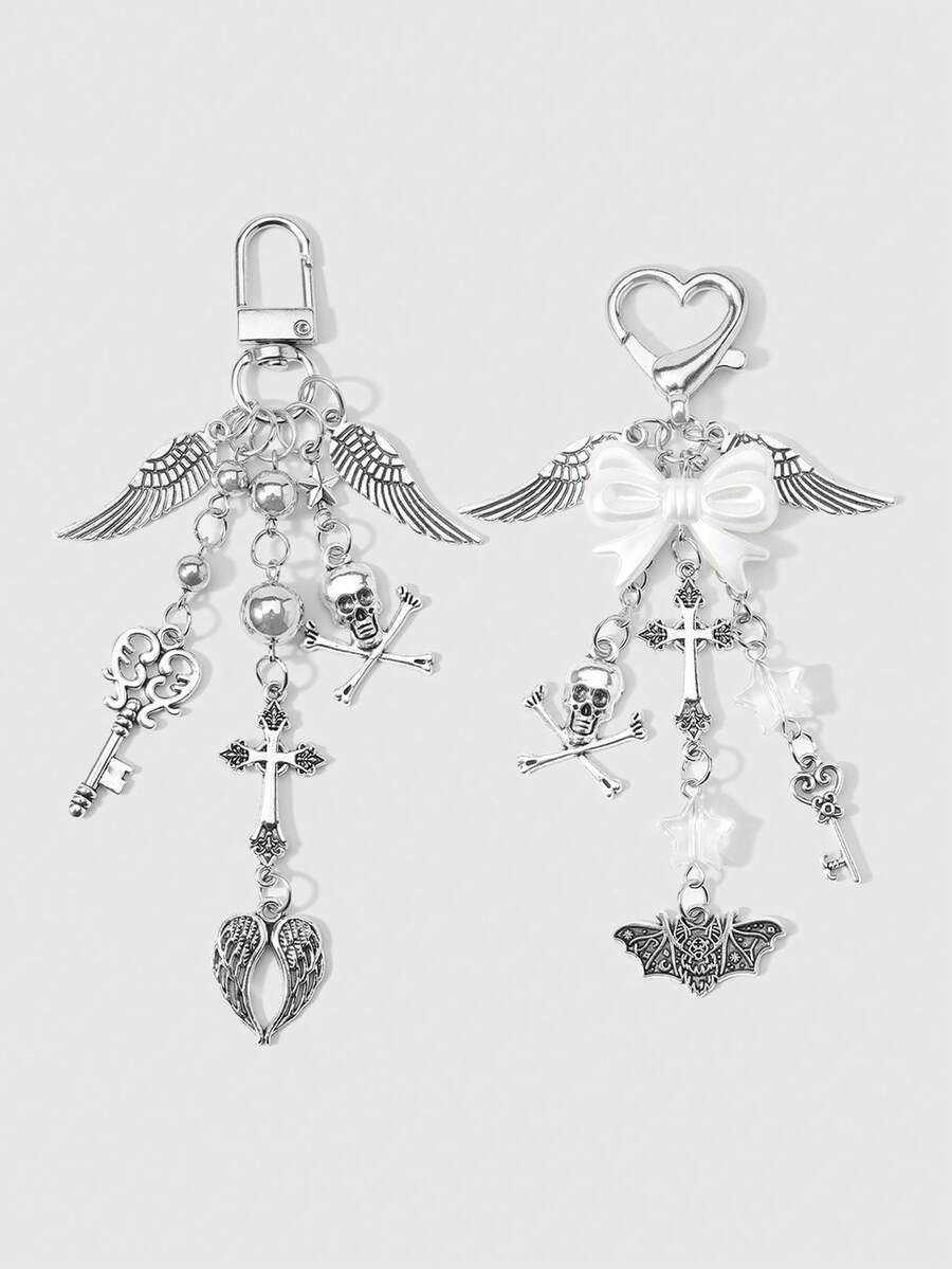 2 nuovi set di accessori in stile Y2K retrò, fashion e dark, con combinazione di elementi gotici come ali d'argento, perle, fiocchi, teschi, croci, pipistrelli e cuori, adatti come accessori quotidiani o regali per coppie, sorelle e fidanzate
