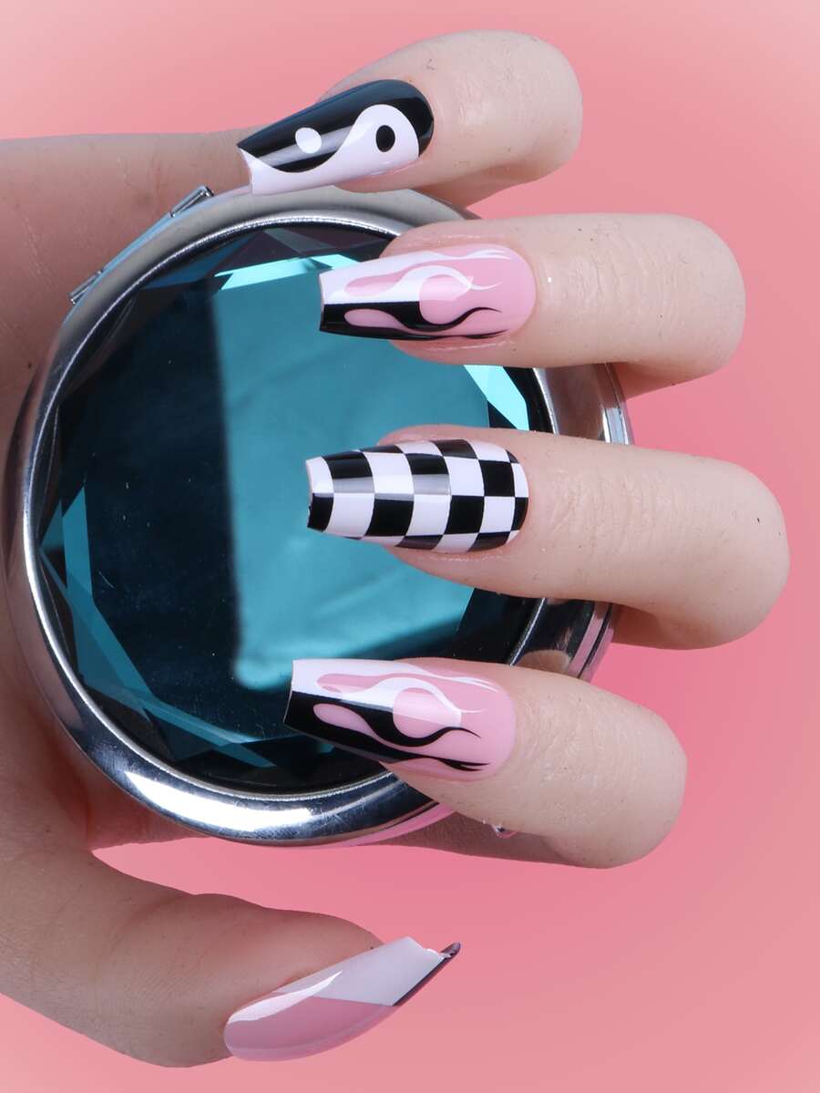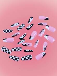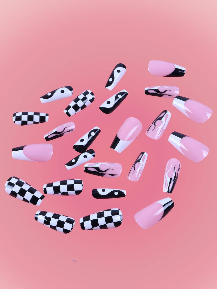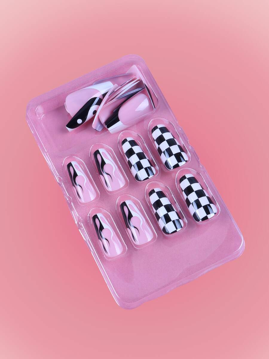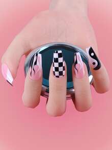 24 pezzi lungo bara con stampa fiamme Unghie finte & 1 foglio nastro