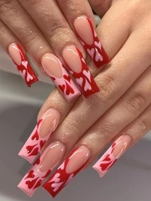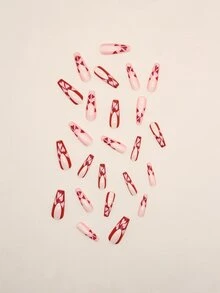 Aggiorna il tuo look con 24 pezzi di unghie finte con stampa a cuore rosso francese a bara lunga e 1 foglio di nastro e 1 lima per unghie