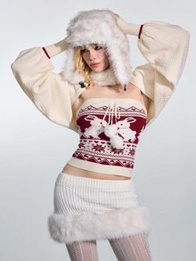 ROMWE Avant 2 pezzi Set maglione da donna con motivo Fairisle jacquard e morbida texture - Top a tubo + Cardigan corto