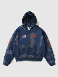 Street Life Giacca in jeans con cappuccio, casual, lavaggio acqua, con stampa di stelle e lettere, uomo, autunno