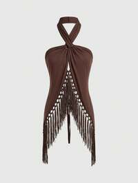 Hippie Blusa retrò da donna per vacanze, stile boho, con collo a canottiera, frange e orlo asimmetrico