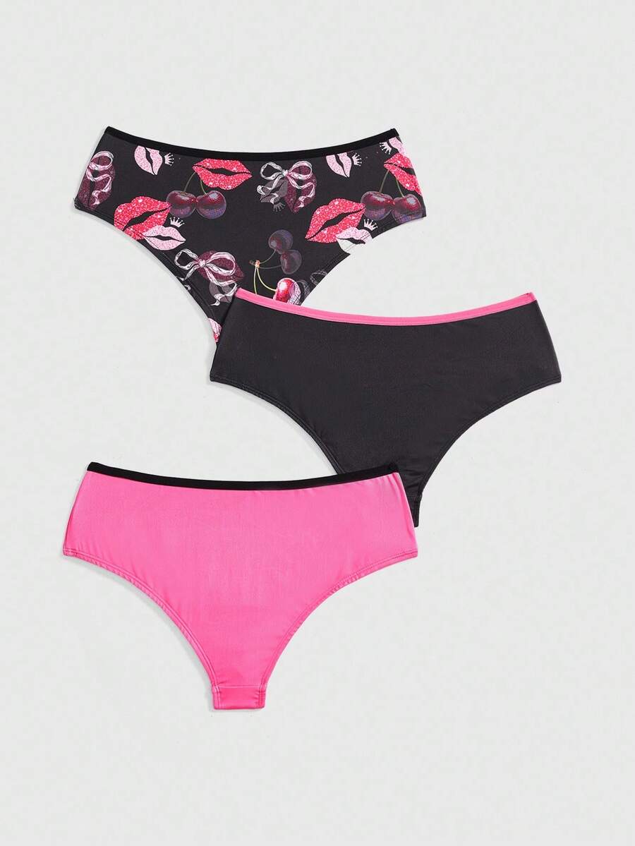 3 pezzi/set di slip bikini con stampa a contrasto di labbra, fiocchi e ciliegie