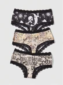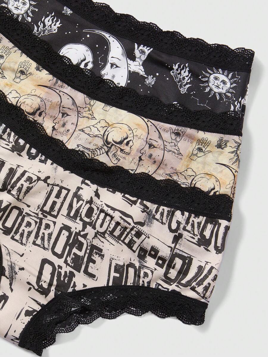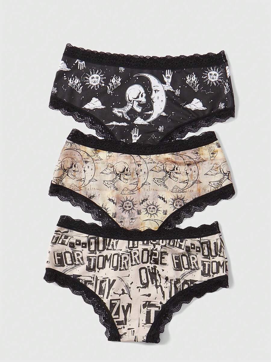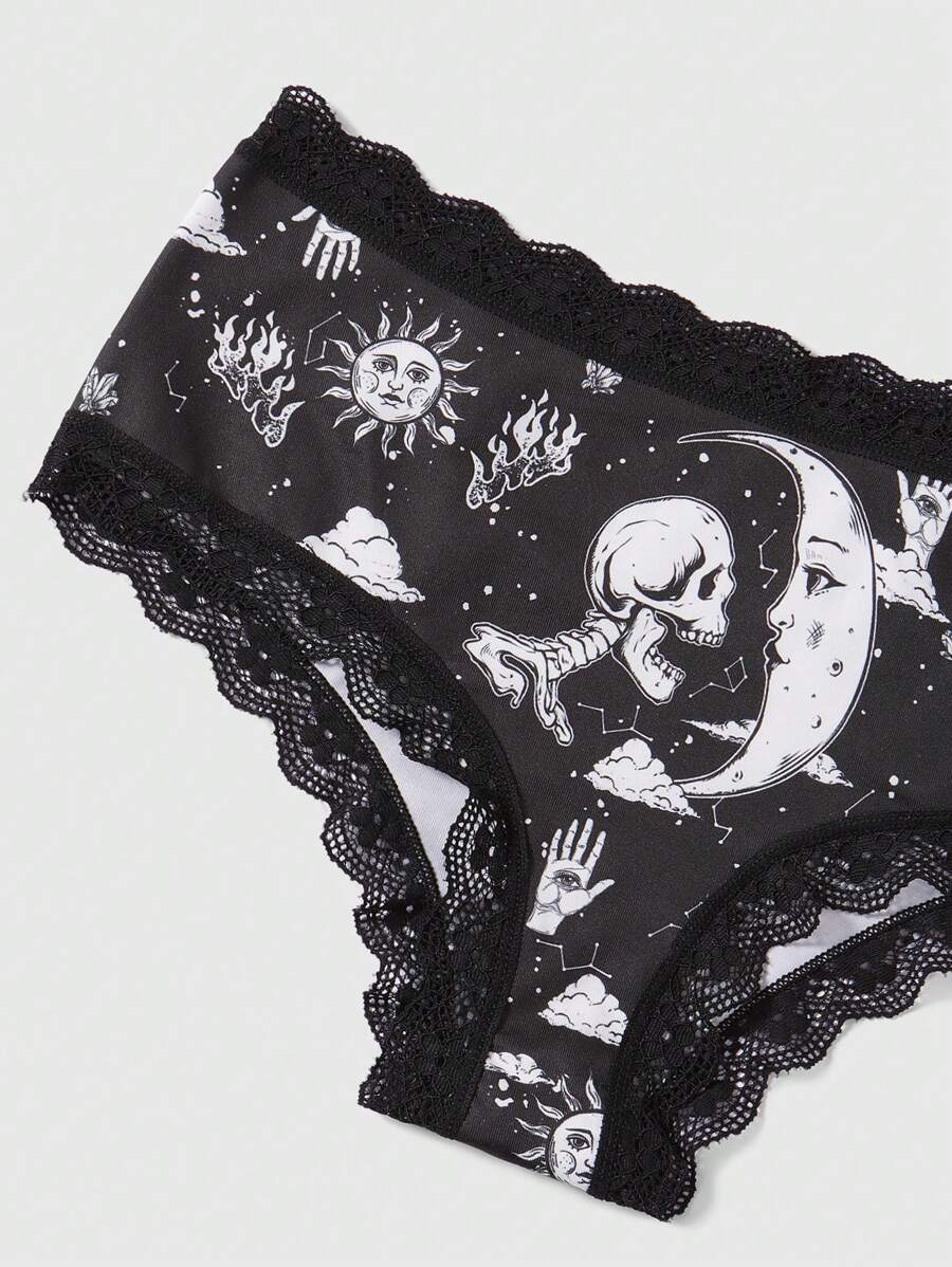 Academia 3 Pezzi Mutandine Dipinte Con Teschio, Sole, Luna E Lettere Per Donne Con Bordo In Pizzo