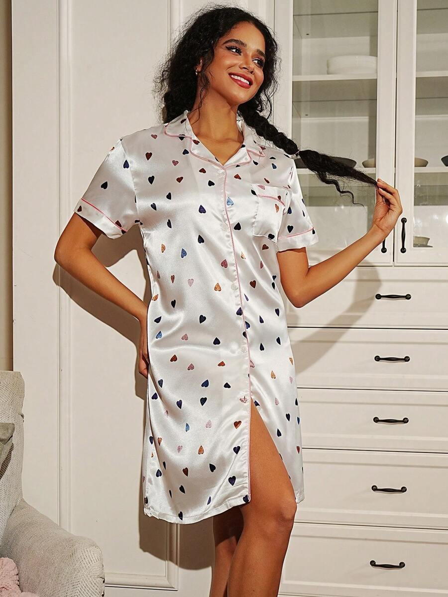 Camicia da notte in raso con stampa a cuori su tutto il capo e inserti a contrasto