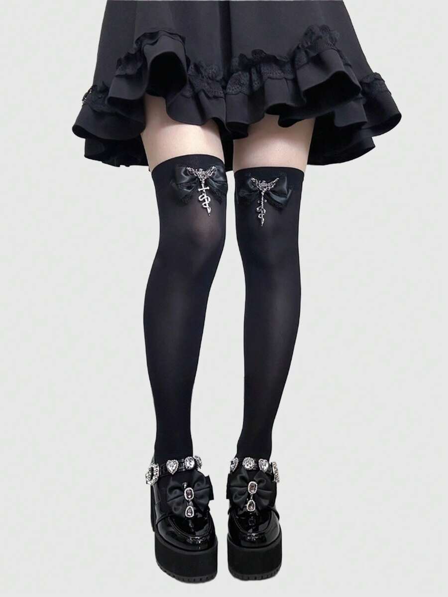 Anime 1 Paio Di Calze Alte Nere In Pizzo E Fiocco Stile Gotico Punk, Calze Al Ginocchio Con Elementi Di Spada, Amore, Serpente Stile Y2K