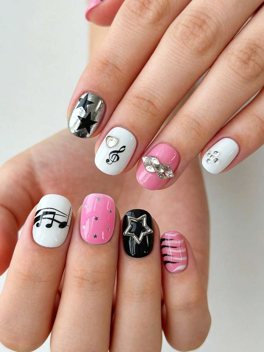 Anime 10 pezzi di elementi di note musicali con gatti carini, unghie finte artigianali di alta qualità + 3 pezzi di nastro biadesivo, unghie corte quadrate staccabili in stile Y2K, pezzi di unghie finte lucide riutilizzabili per tutte le stagioni, adatti per feste, balli e uso quotidiano.
