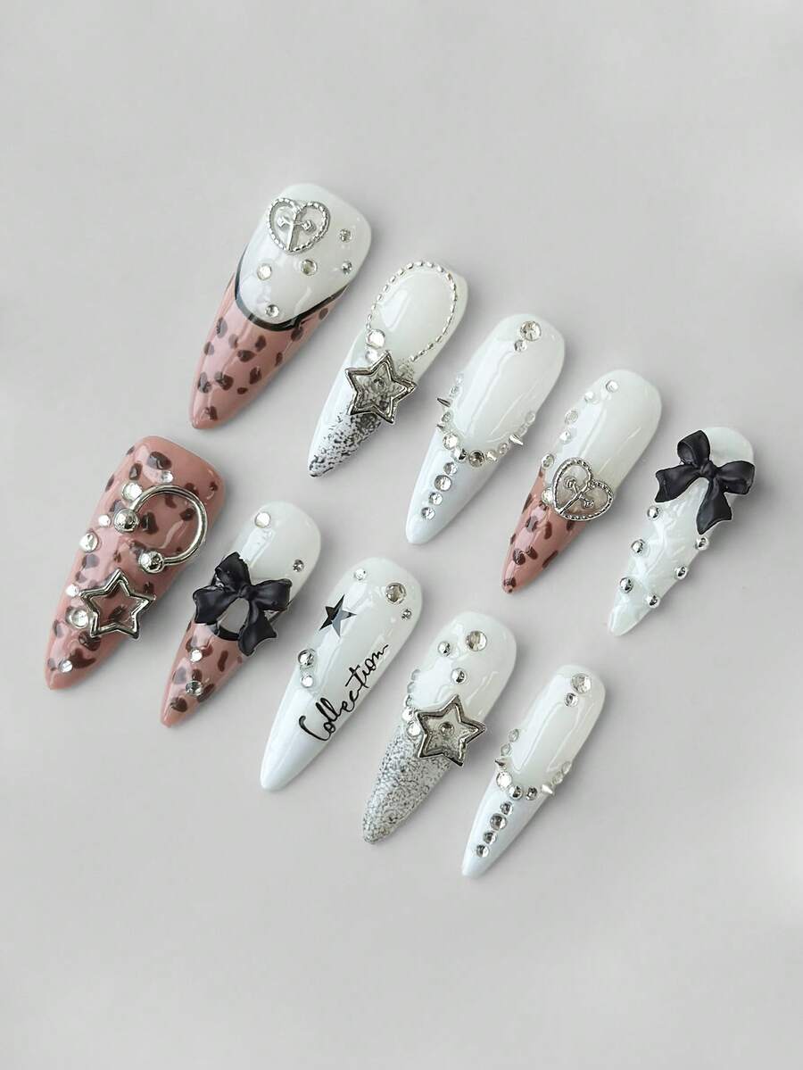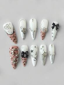 Anime 10 pezzi Unghie finte di alta qualità con fiocco carino, nota musicale, elemento a stella, realizzate a mano + 3 pezzi di adesivo biadesivo, Stickers per arte di unghie rimovibili con catena di strass stile francese Y2K a pois, adatti per vacanze, feste, ballo e uso quotidiano