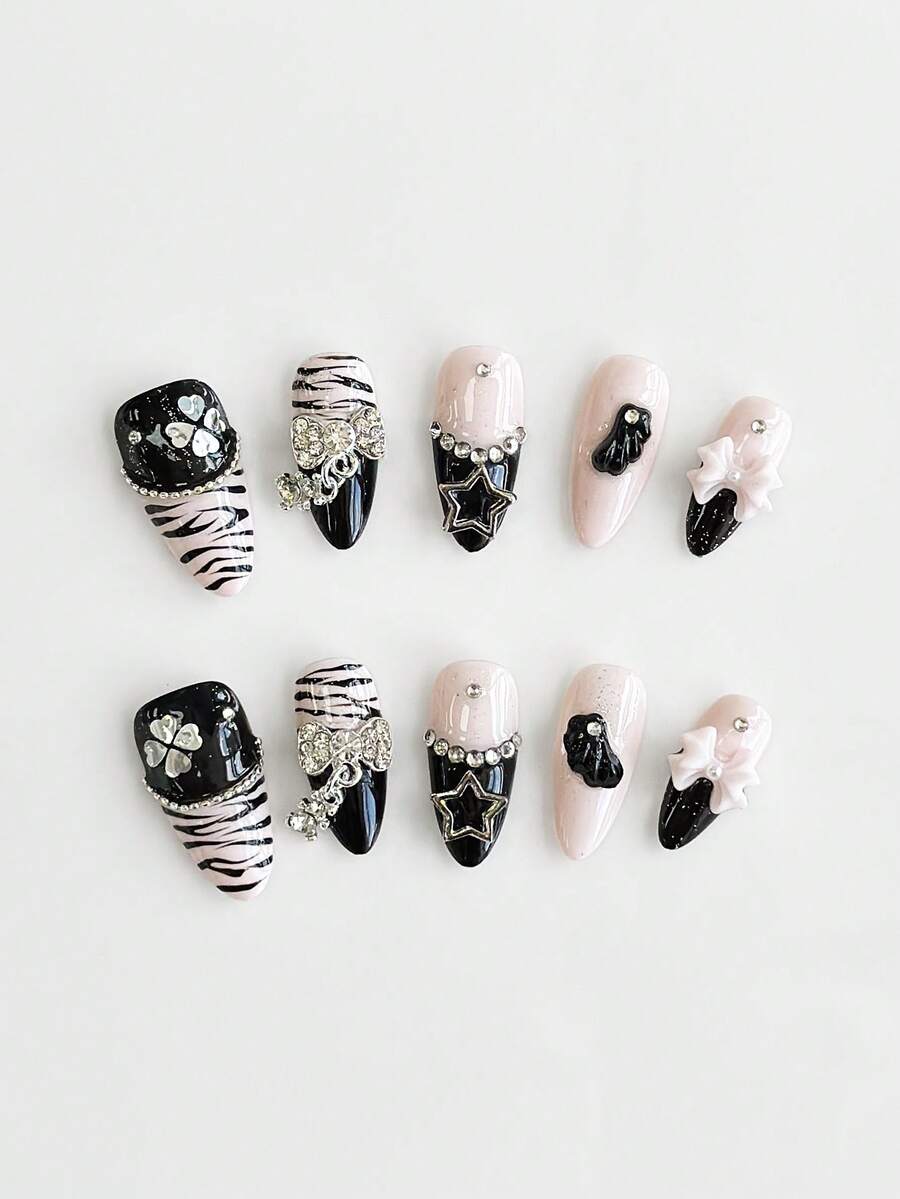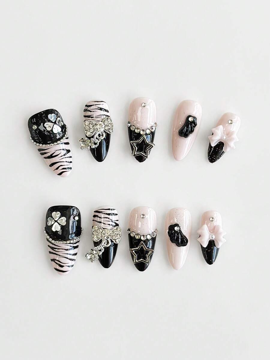 Anime 10 pezzi di unghie finte di alta qualità con elementi decorativi come ali, rose, fiocchi, note musicali e stelle, stile Y2K con strass, pois rosa, pizzo bianco rimovibile, adatti per vacanze, feste, ballo e uso quotidiano + 3 pezzi di adesivo biadesivo