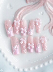 Anime 10 pezzi French Line dolce e carino Y2k sparkling glitter bow pearl false nails dipinte a mano + 3 fogli di nastro biadesivo