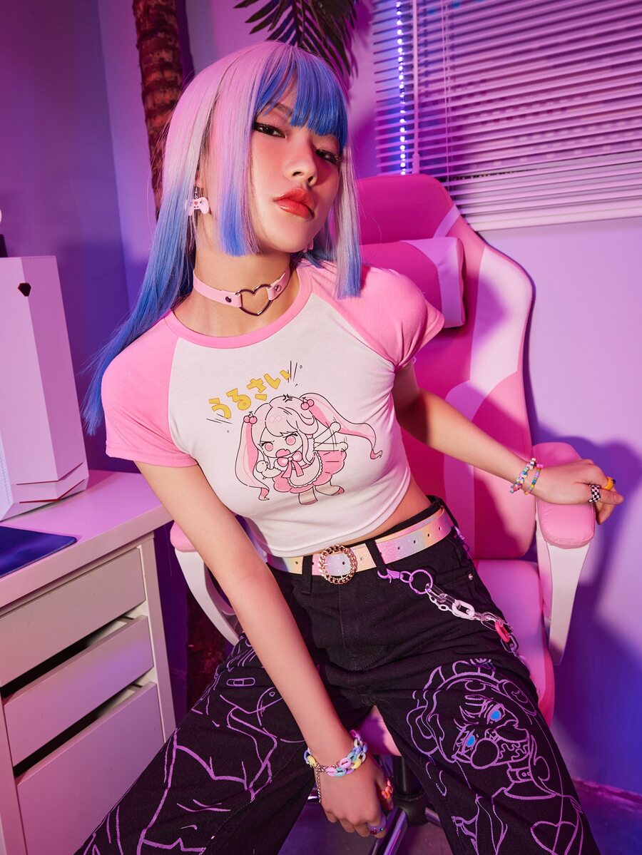 Anime Maglietta corta con grafica ritratto fumetto color block
