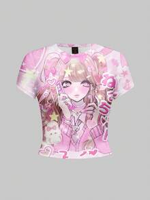 maglietta a maniche corte da donna con stampa di cuori stile anime kawaii