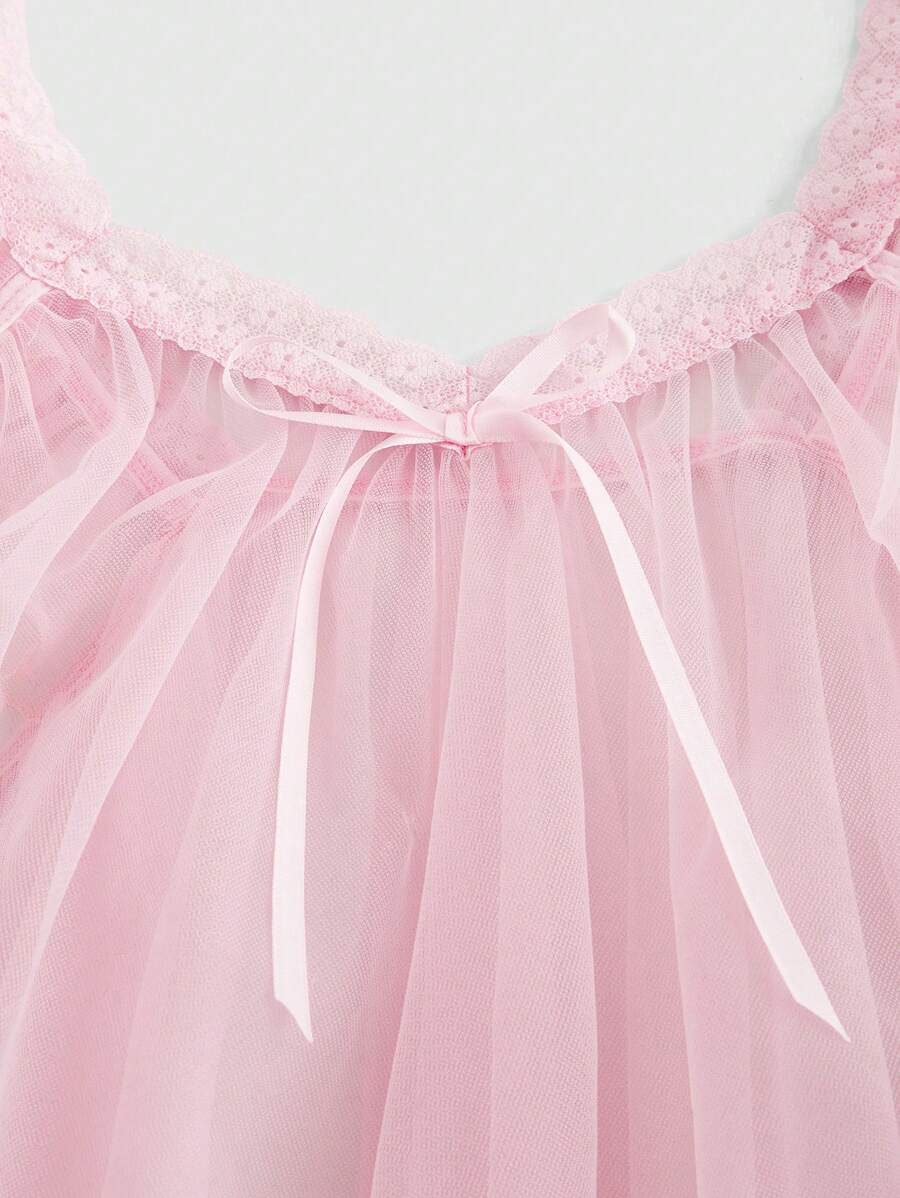 Kawaii Abito babydoll carino e morbido, trasparente, vestito mini in pizzo rete con fiocco, set di abiti tulle sexy