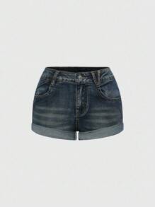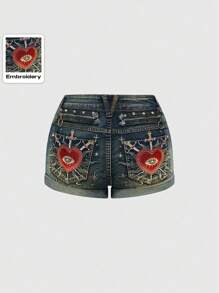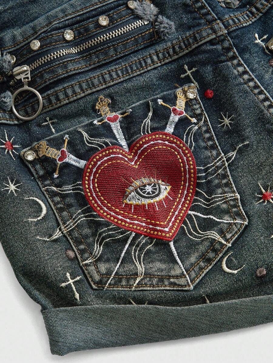 Fairycore Shorts di jeans con decorazioni barocche gotiche, ricami a forma di cuore, strass a forma di lacrima e stella