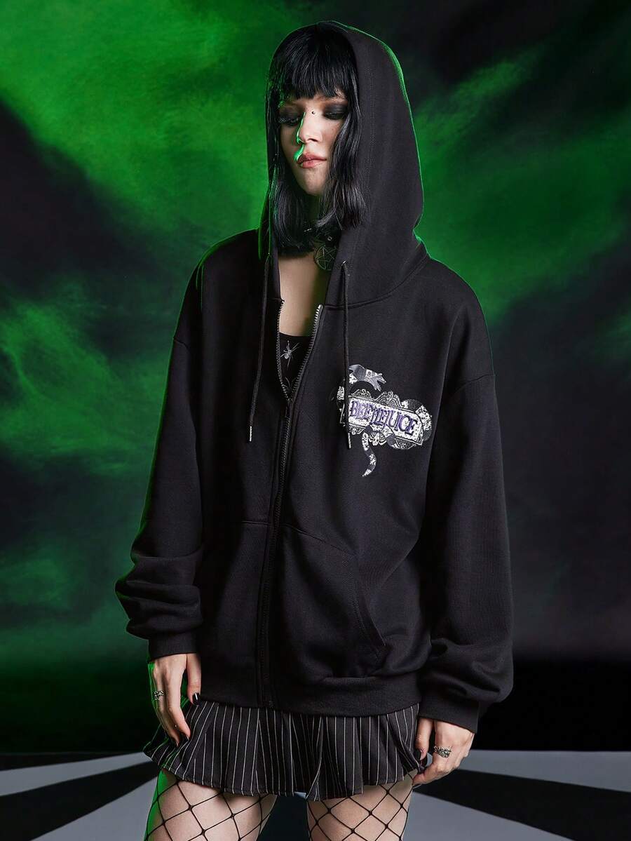Beetlejuice | ROMWE Felpa con cappuccio, chiusura lampo, spalle cadenti e stampa di personaggi orrore e lettere, casual, con laccio coulisse, per donna, primavera e autunno