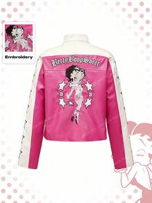 Betty Boop | ROMWE Giacca da motociclista da donna in stile Y2K, con grafica ricamata a figura cartoni animati, dolce e cool, in pelle sintetica (PU) e patchwork, in stile racing