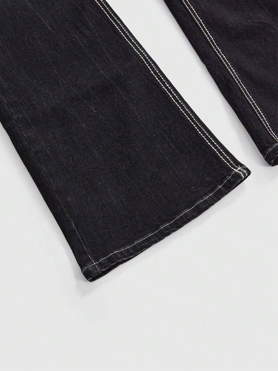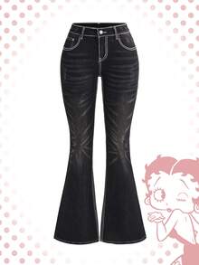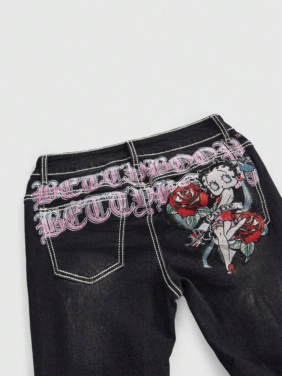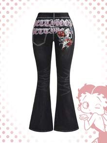 Betty Boop | ROMWE Jeans a vita super bassa a zampa di elefante con ricamo Betty in stile retrò Y2K consumato per donne