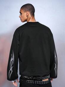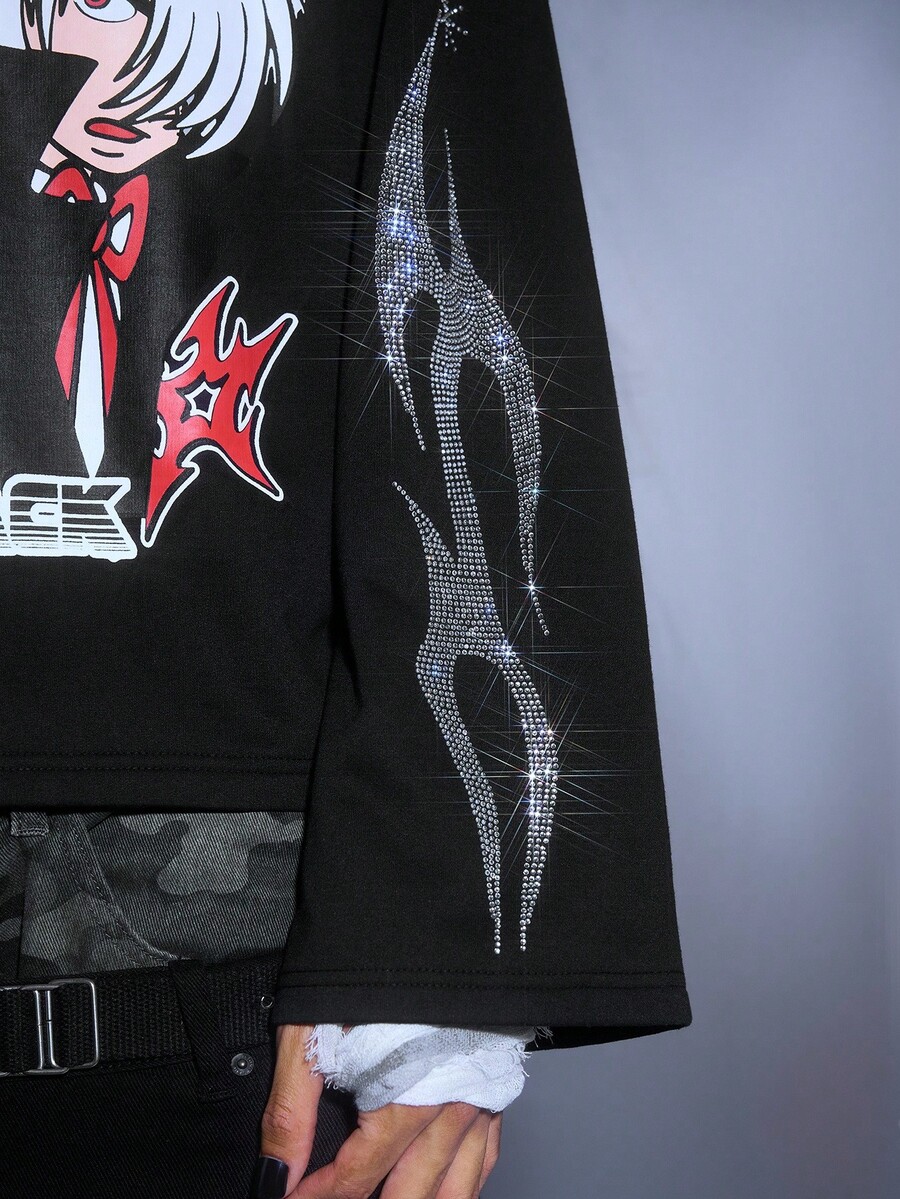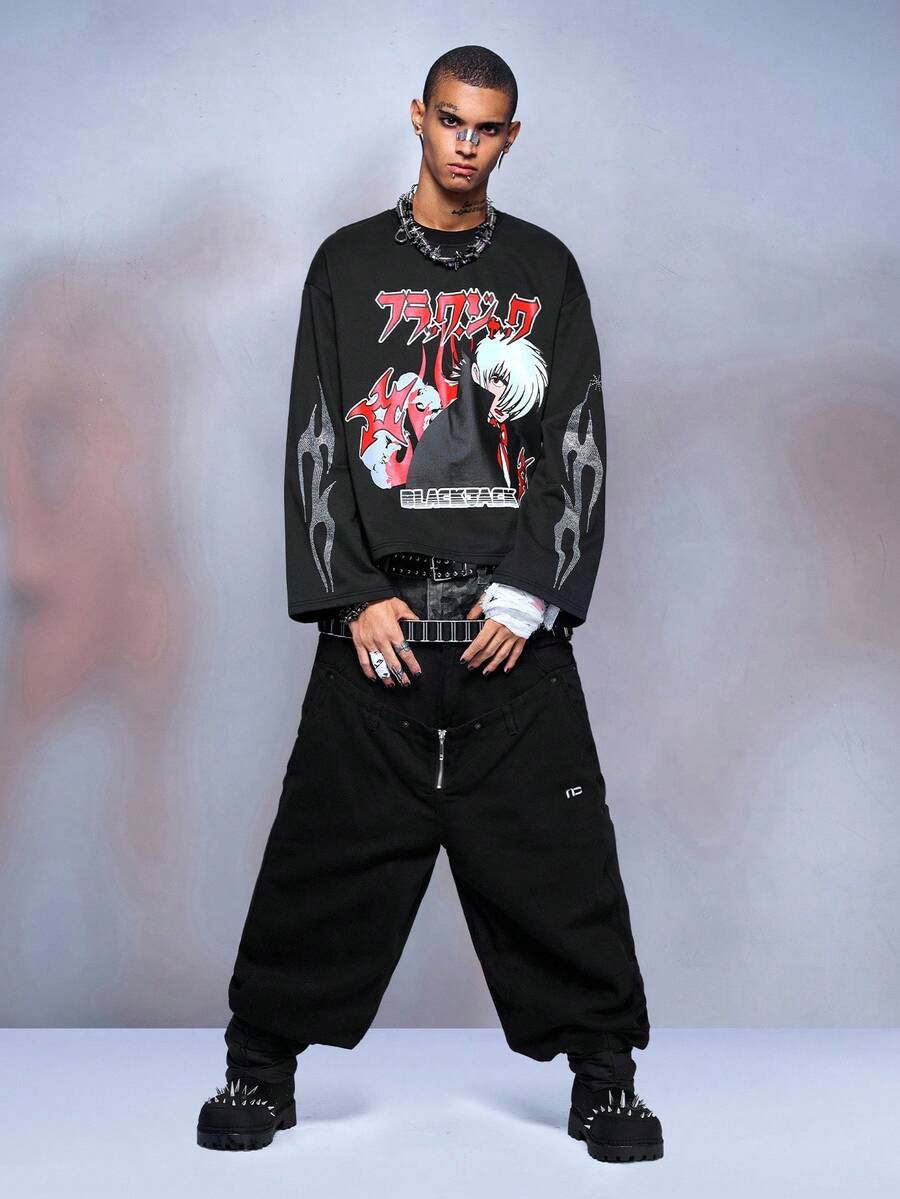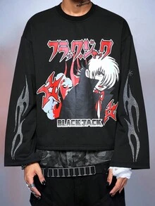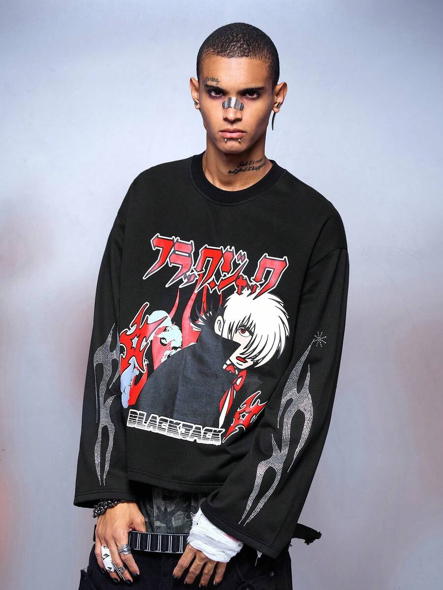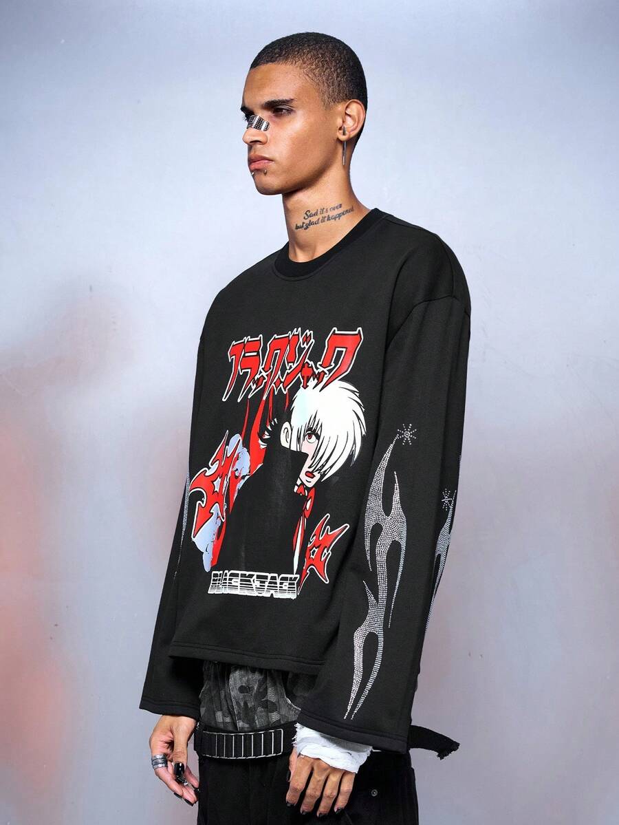 Black Jack X ROMWE Street Life Felpa girocollo nera con grafica di figure cartoni animati per uomo