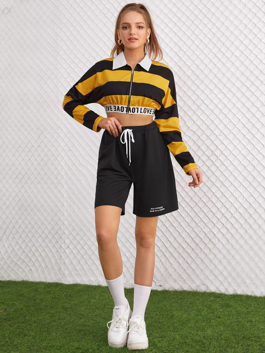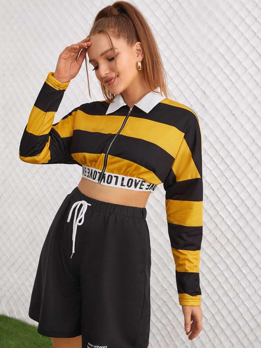 Felpa da raccolto frontale con zip a nastro della lettera della spalla goccia a righe blocchi
