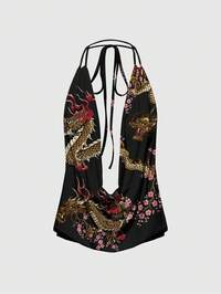 ROMWE Avant Canotta da donna con scollo alla halter, schiena scoperta, con grafica stile cinese di drago e fiori di pruno
