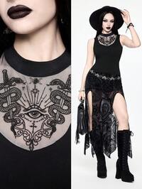 Canotta aderente con colletto alto, design occhio di serpente e motivo traforato, stile boho goth