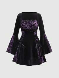 Goth Abito mini in velluto con maniche a campana, decorazione floreale e patchwork in stile gotico per donna