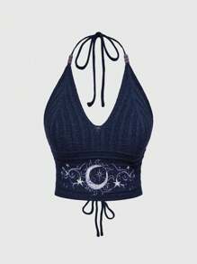Top a canotta in stile boho da donna, con vibrazioni da vacanza hippie, ricamo di occhi, luna e stelle, in maglia blu-verde con perline
