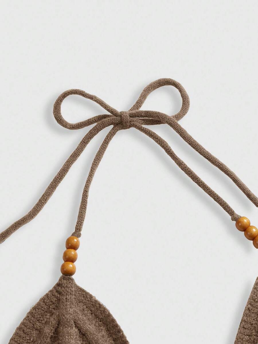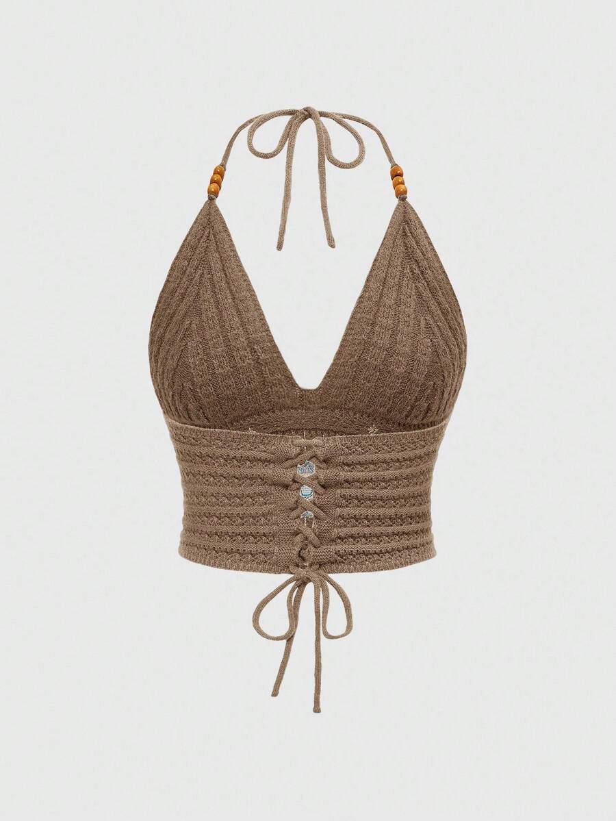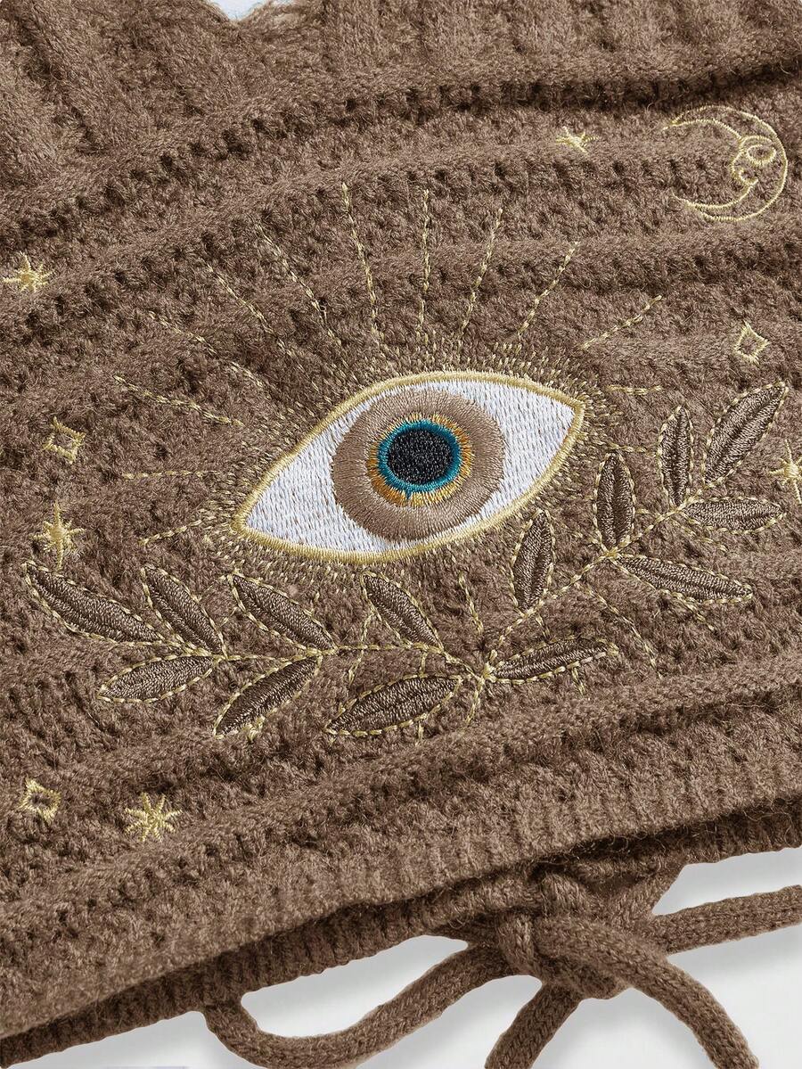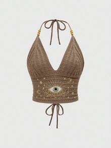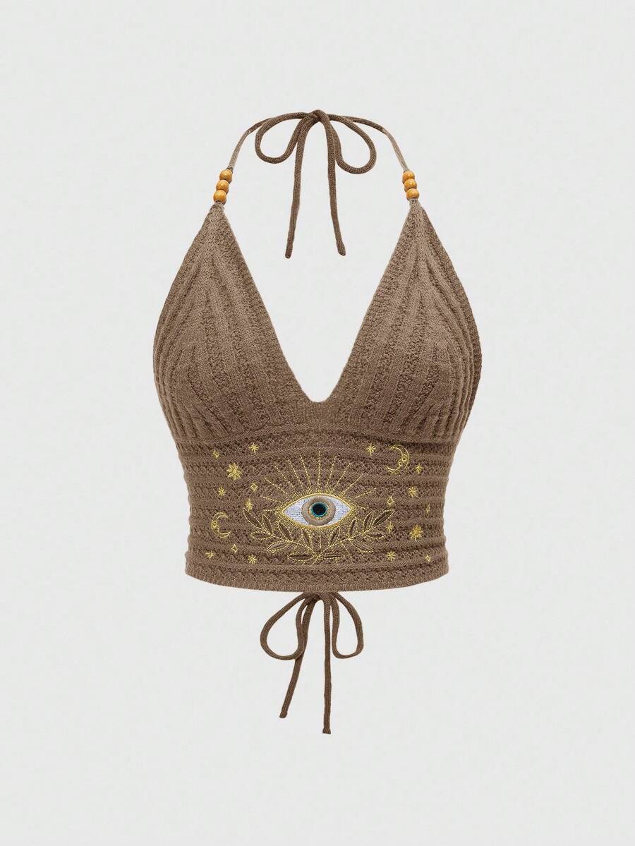 Outfit estivo boho da donna, stile hippie da vacanza, con ricamo di occhi, luna e stelle, top lavorato a maglia con perline blu-verde