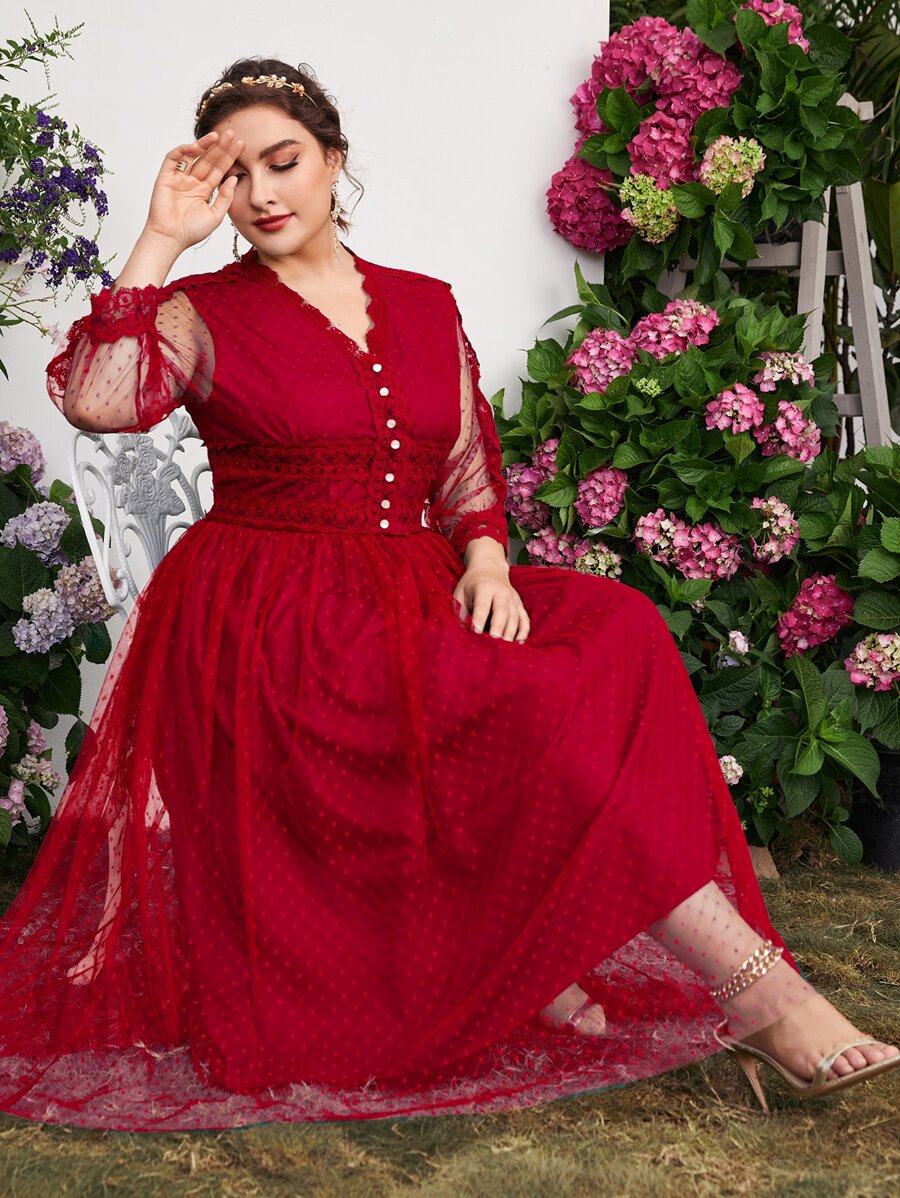 Vestito a-line in bordeaux con sovrapposizione di pizzo e rete a contrasto
