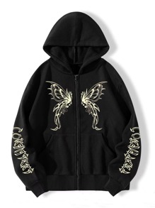 Felpa con cappuccio con grafica lettera e farfalla con zip foderato termico