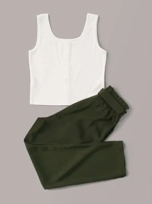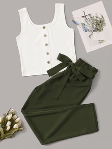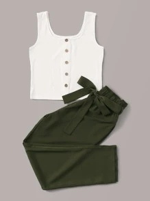 Top canotte a costine con bottone e Pantaloni con cinture e vita a volant sovrapposti