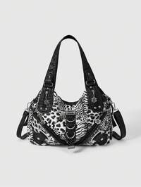 Grunge Punk Borsa a spalla da donna in stile moda con stampa leopardata e patchwork, adatta per uso quotidiano