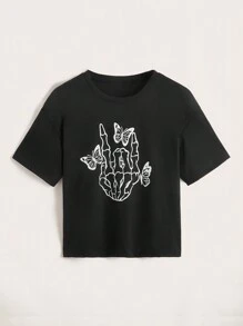 T-shirt casual a maniche corte con stampa di teschi e farfalle, estiva