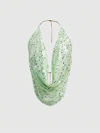 Top da donna senza schienale con scollo drappeggiato, pesantemente decorato con ricami e perline, adatto per vacanze e momenti sexy