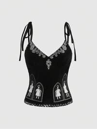 Canotta da donna in stile anime dark con inserti in pizzo a contrasto, collo alla halter e fiocco