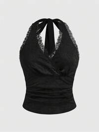 Goth Top senza schienale con scollo drappeggiato in pizzo a contrasto, in stile retrò Y2K, sexy