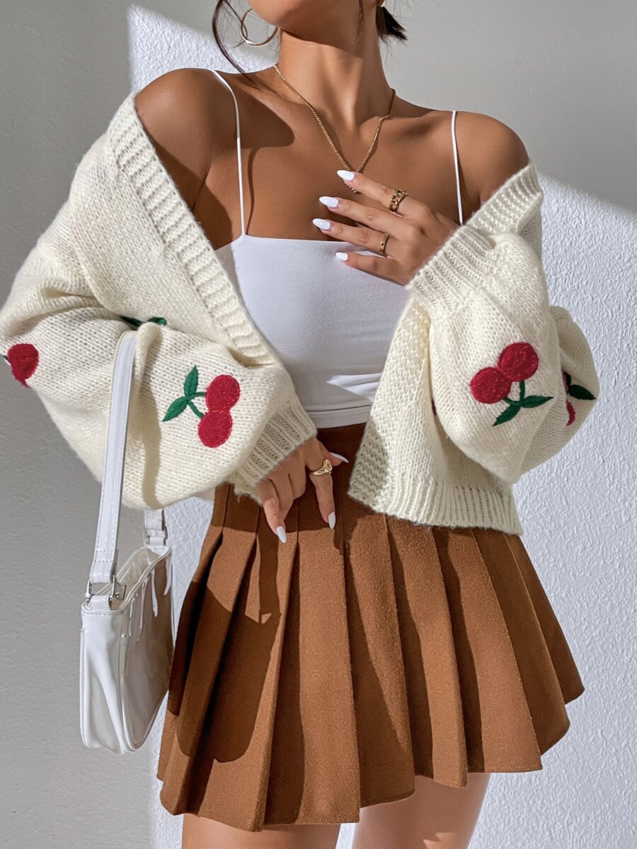 Cardigan con maniche a lanterna e ricamo di ciliegie,Top a maniche lunghe