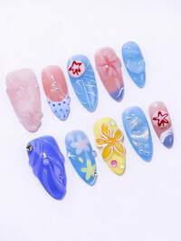 Anime 10 Adesivi per unghie finte con motivo a conchiglia in stile vacanza sull'isola, semplice e fresco, con un pezzo di nastro biadesivo