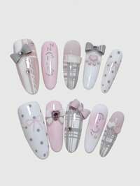 Anime 10pcs Cute Bowknot Music Note Star Element High Quality Handmade False Nails + 3pcs Double-Sided Adhesive, Y2K French Style Rhinestone Chain Polka Dot Removable Nail Art Stickers, Suitable For Holidays, Parties, Dancing And Daily Wear