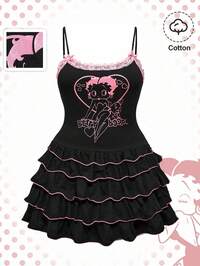 Betty Boop | ROMWE Abito da donna taglie forti estivo con motivo a cartoni animati, con inserti in pizzo a contrasto e balze sul fondo
