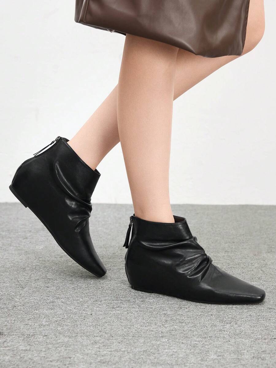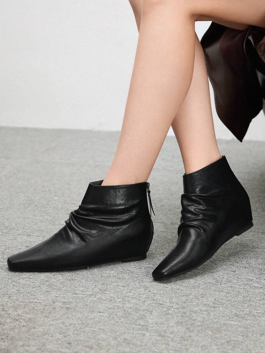 Stivaletti alla caviglia neri classici con tacco a zeppa nascosto, design grinzoso, cerniera sul retro, snellente e versatile per San Valentino